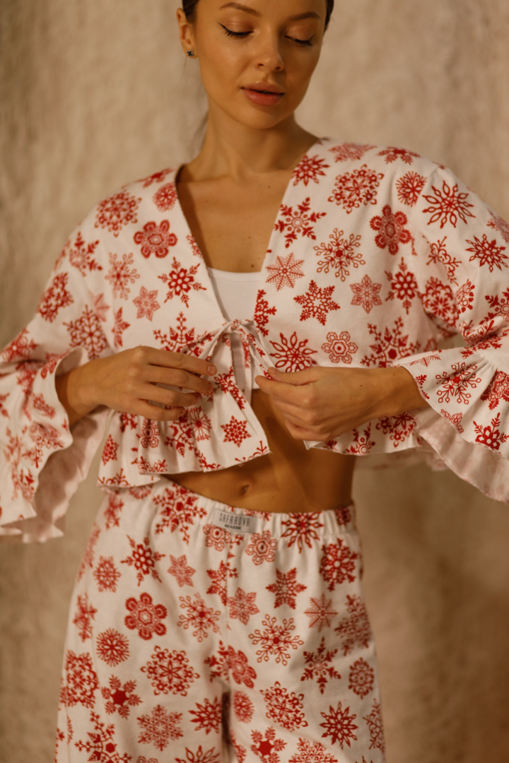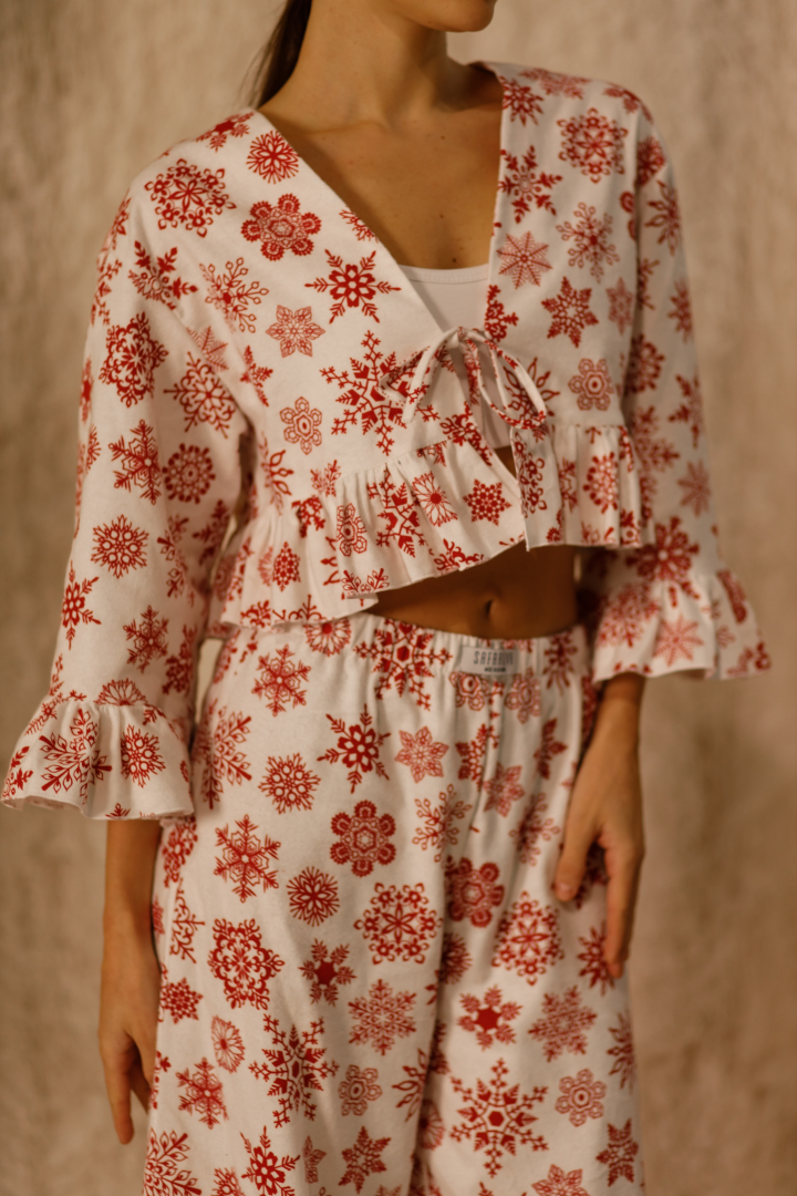 Затишна та святкова піжама REMI створена спеціально для новорічної атмосфери. Принт сніжинки на білому фоні та милі рюшики роблять комплект яскравим, стильним і дуже комфортним.