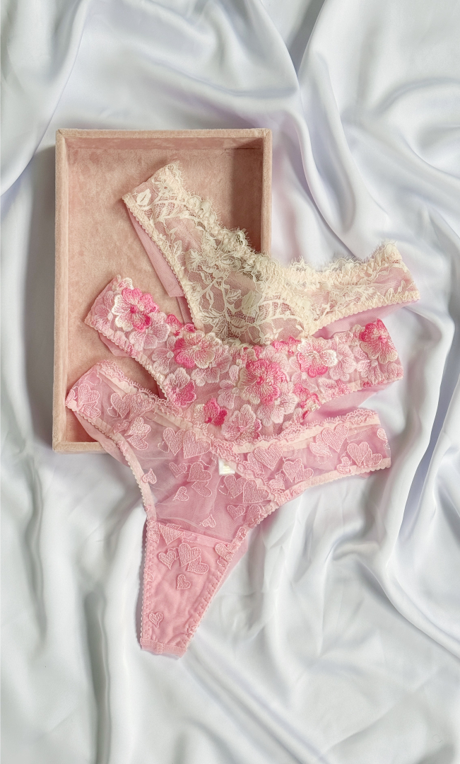 Цей розкішний комплект із трьох бразилійок рожевого кольору та з унікальними дизайнами стане прекрасним вибором для вашого гардеробу. Кожна пара виконана з різного мережива, прикрашеного витонченими квітковими вишивками, що надає виробам елегантності та чарівності. Завдяки високій якості матеріалів, цей набір чудово підходить як для щоденного носіння, так і для особливих випадків.