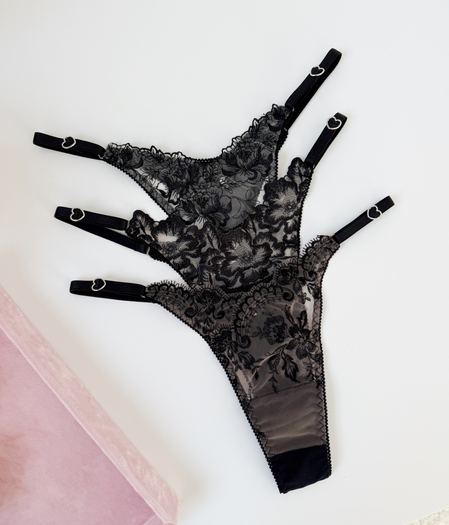 Витончений набір чорних стрінгів із мережива — це поєднання ніжності та спокуси. Кожна модель створена з делікатного мережива з вишуканим візерунком, що красиво підкреслює фігуру.