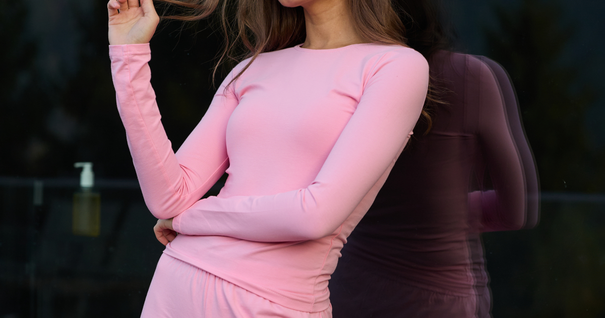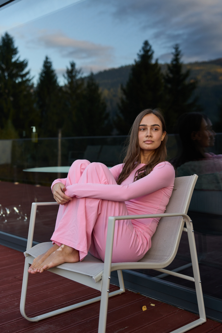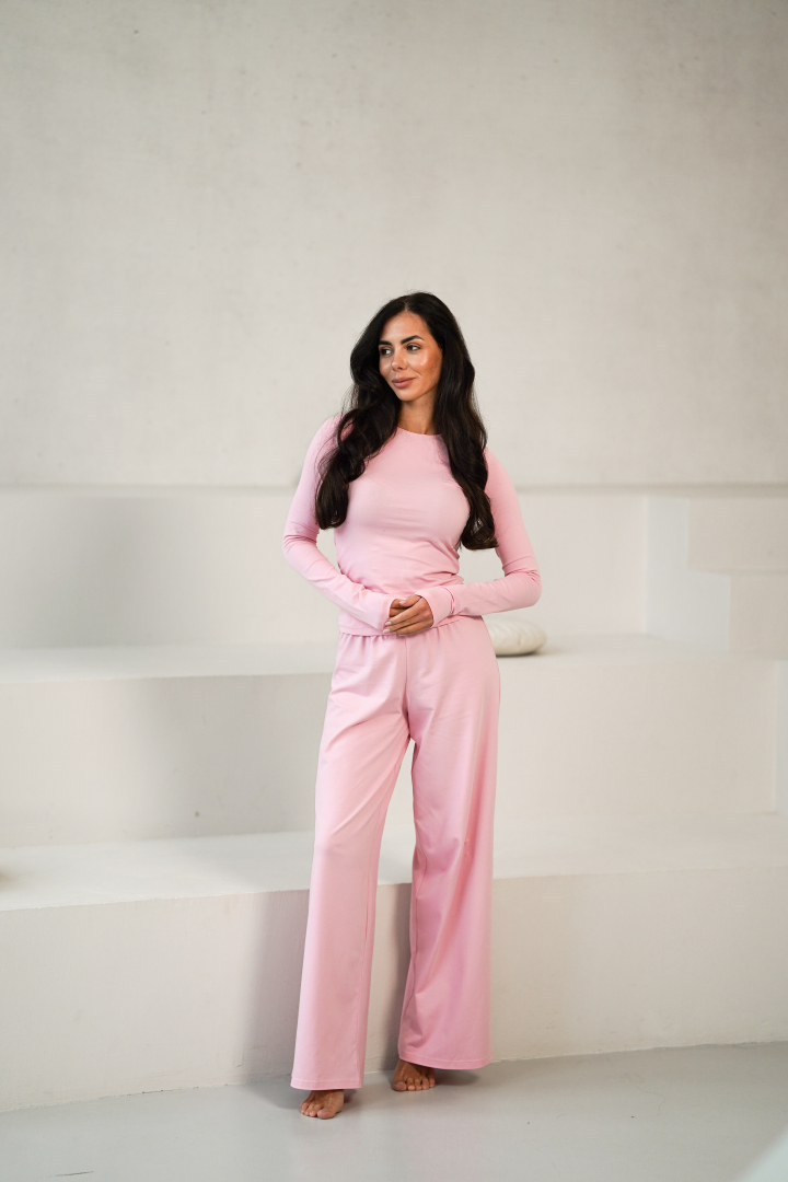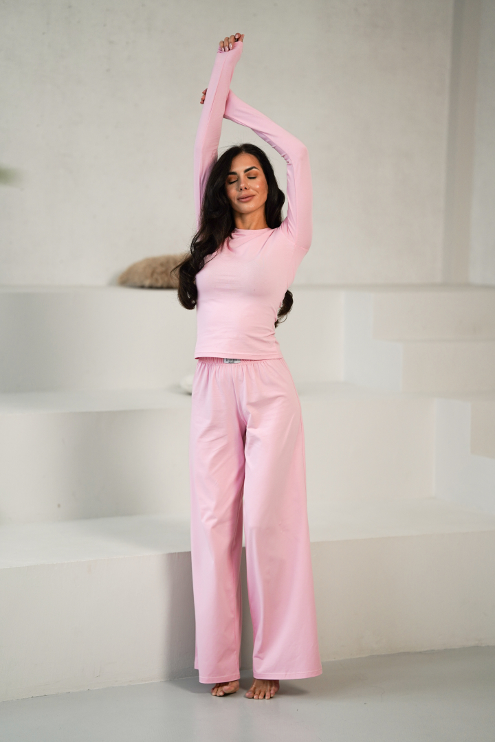 The pajama consists of two pieces — a fitted long-sleeve top and wide-leg pants.