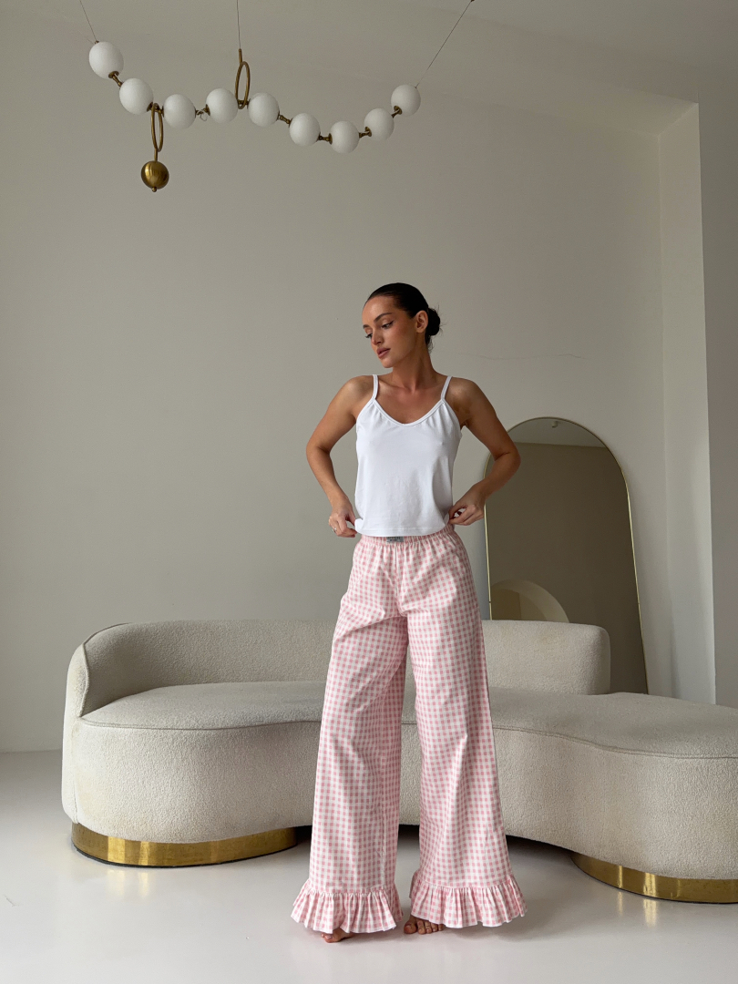 Нежная и комфортная пижама REMI выполнена из качественных натуральных материалов и украшена милыми рюшами. Принт в розовую клетку добавляет легкости и уюта, делая комплект идеальным для сна и домашнего отдыха.