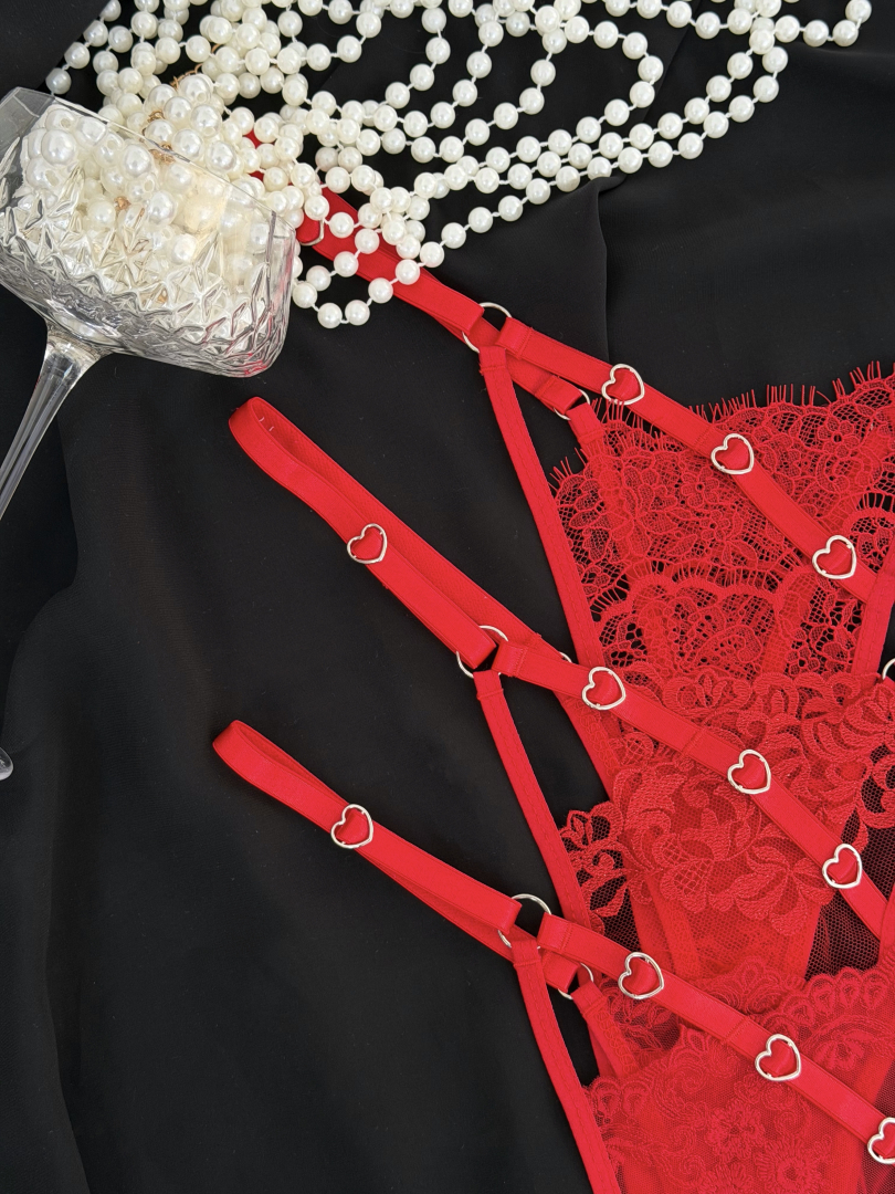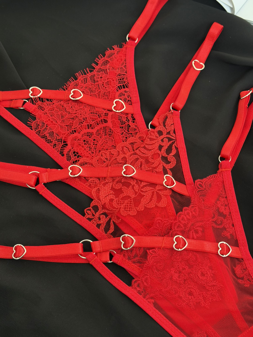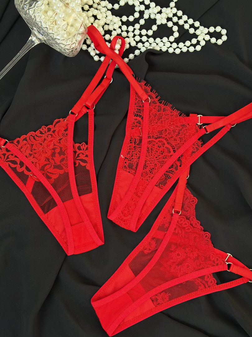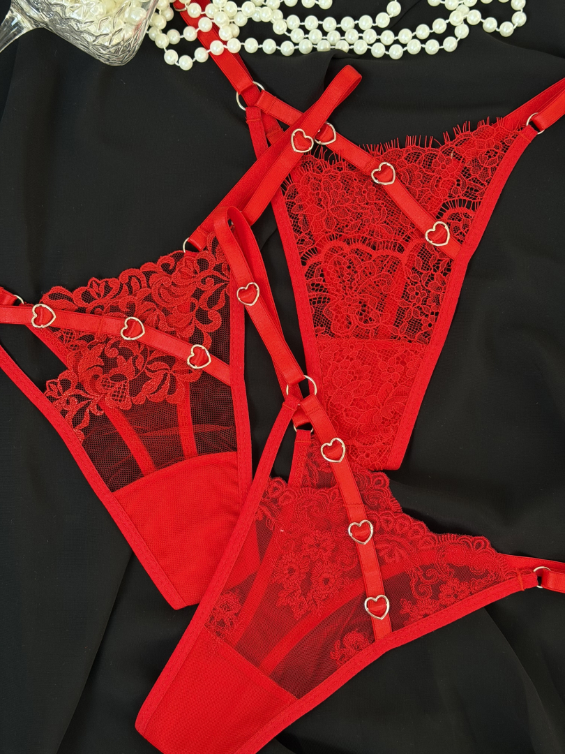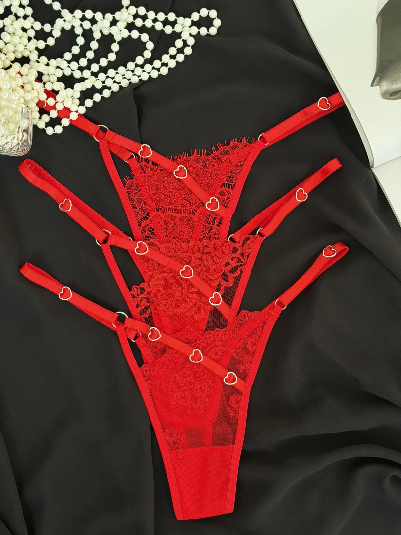 Соблазнительный набор трусиков в насыщенном красном цвете, созданный для подчёркивания женственности и уверенности в себе. Изящное кружево в сочетании с полупрозрачной сеткой мягко подчёркивает формы, а декоративные металлические сердечки добавляют романтичный и провокационный акцент.