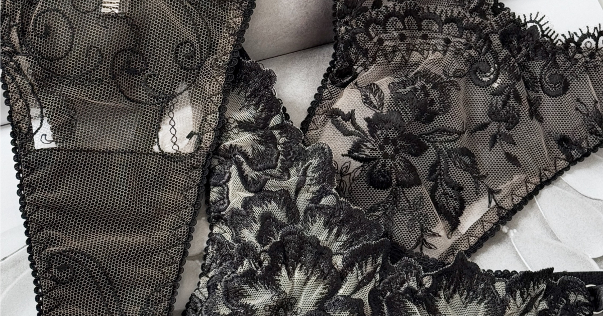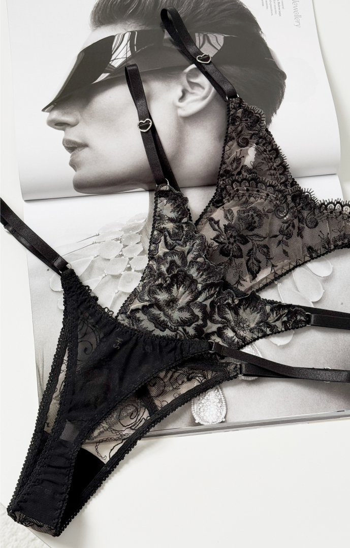 Изысканный набор черных кружевных стрингов — сочетание нежности и соблазна.
