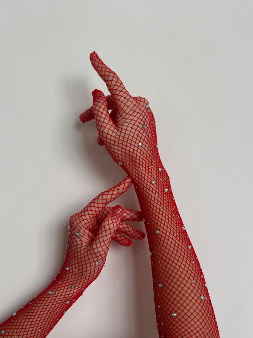 - Идеальный акцент для образа: Красные перчатки придают образу смелости, а стразы – яркого акцента, подчеркивая индивидуальность и стиль.